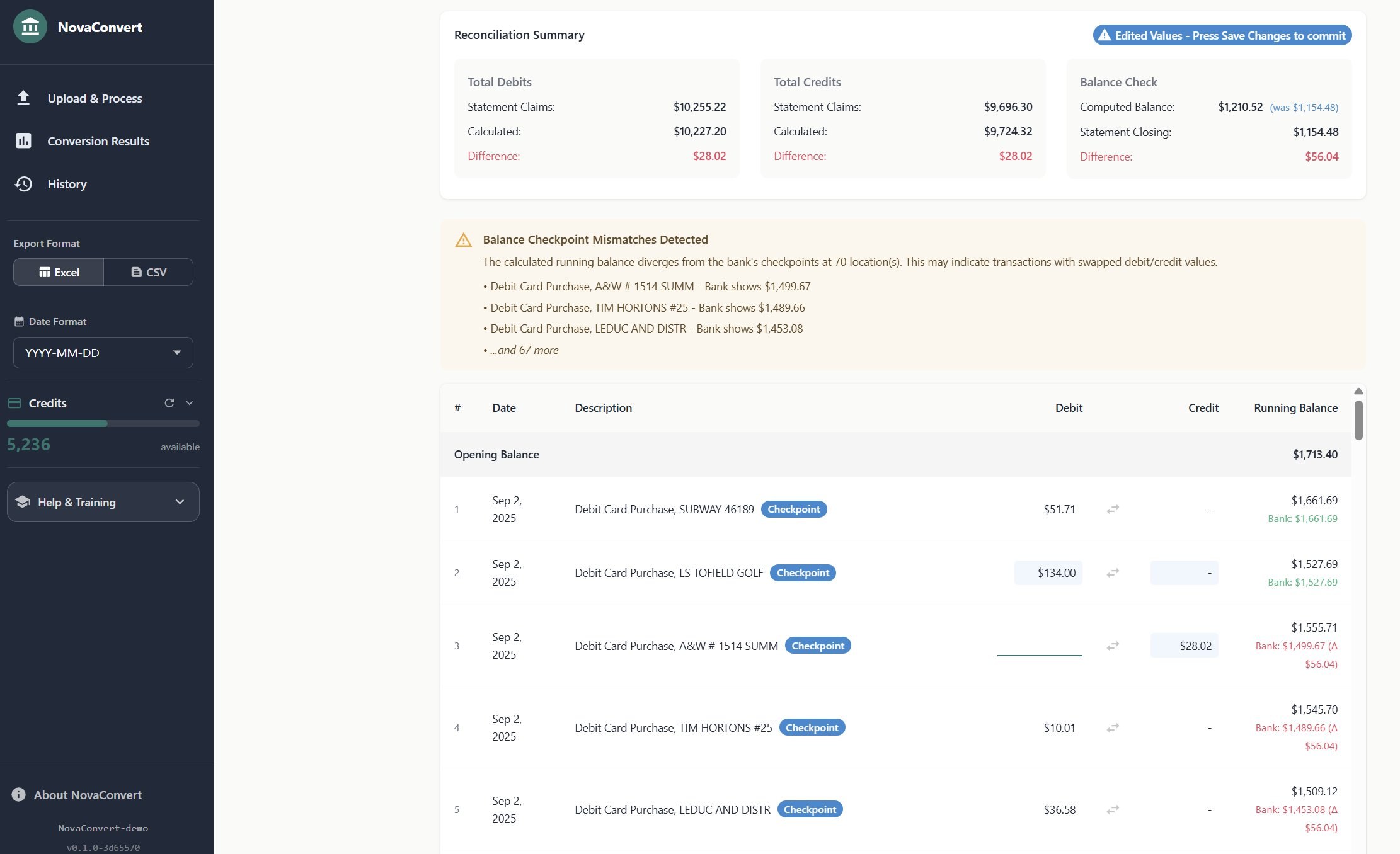 No extraction pipeline is 100%. Unresolved cases shouldn't dead-end into an error state. The reconciliation page is built as a live spreadsheet — PDF on one side, transaction grid on the other. Cell-addressable edits, sign flips, and missing-row inserts all recompute the running balance immediately, and the bank's stated closing is rendered alongside the computed one at every row.